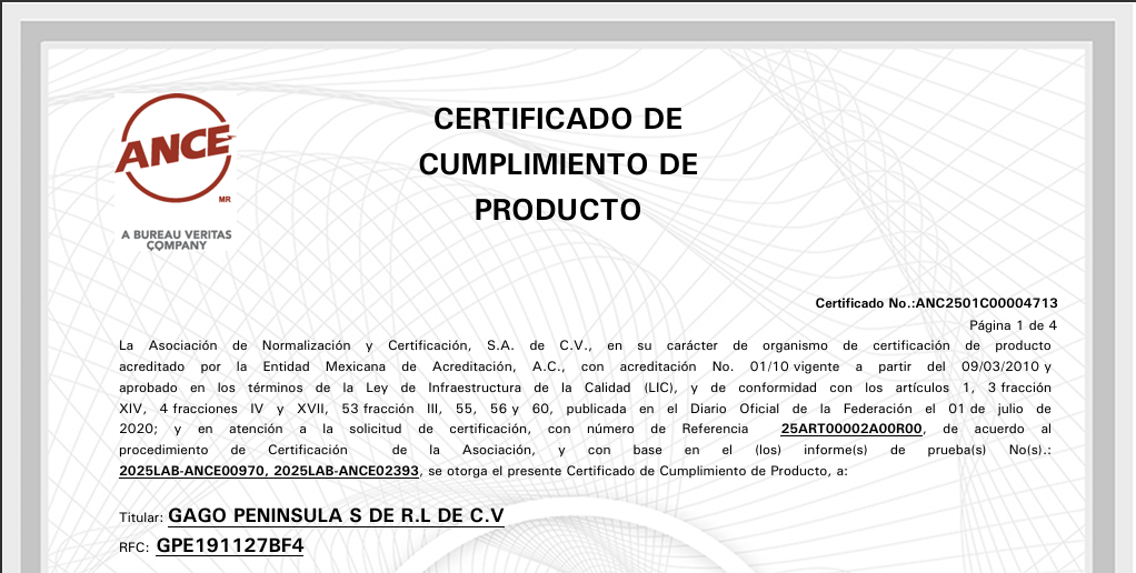 Este reconocimiento garantiza que nuestros productos han sido evaluados y aprobados por un organismo certificado, brindando confianza, respaldo y seguridad a todos nuestros clientes.